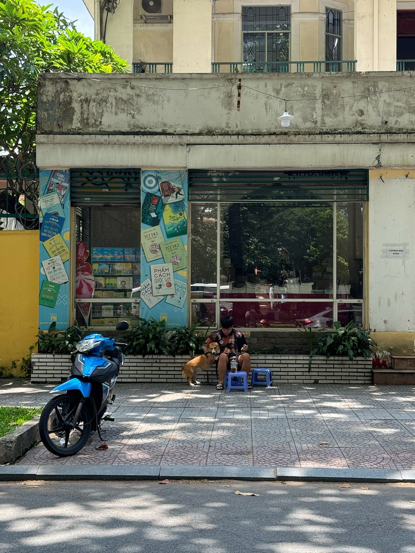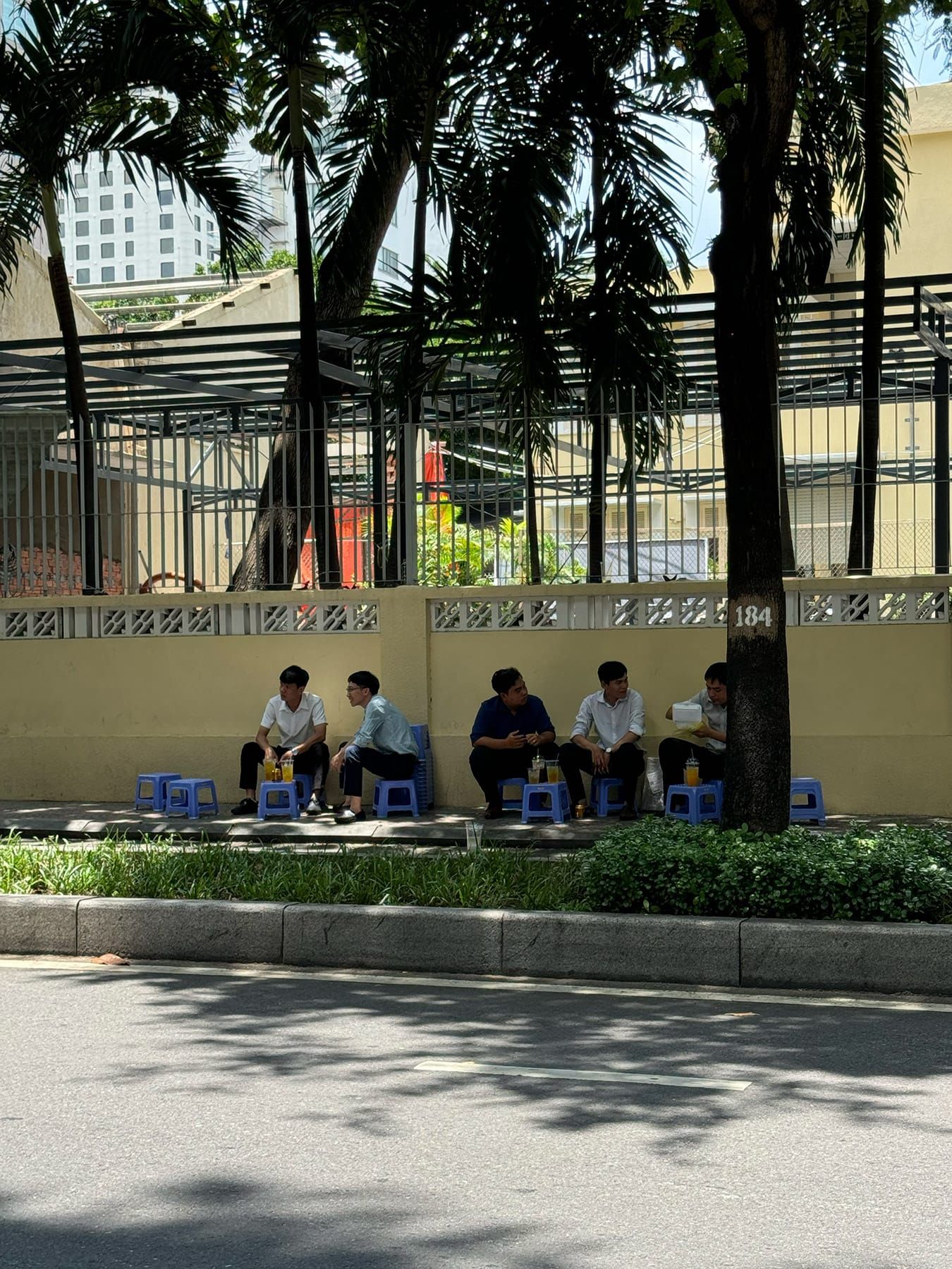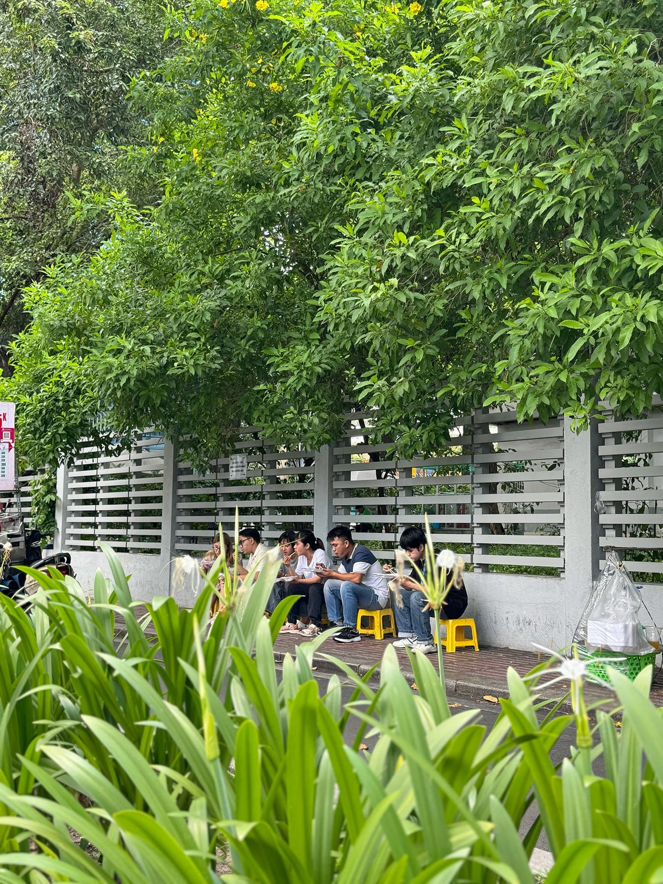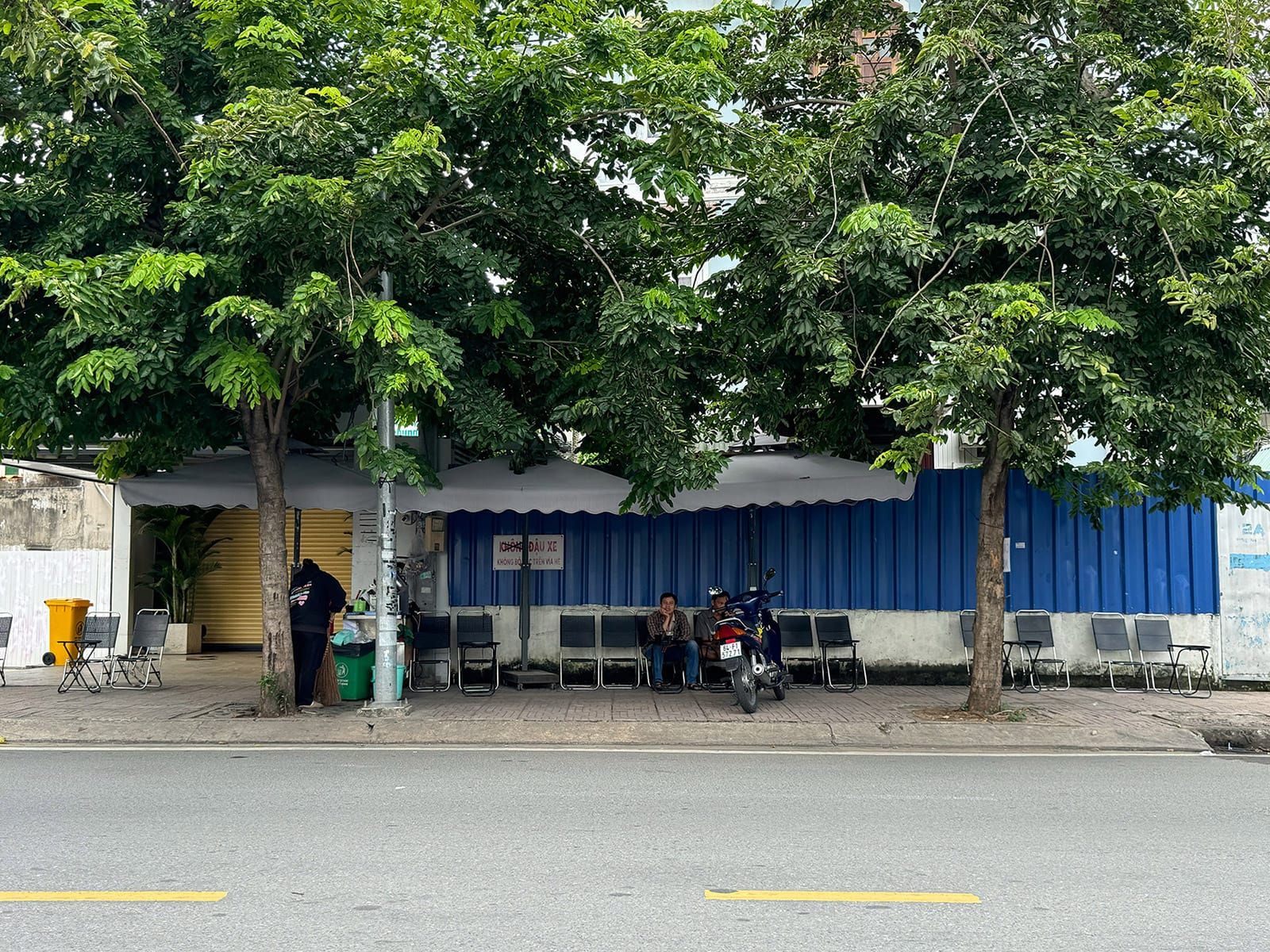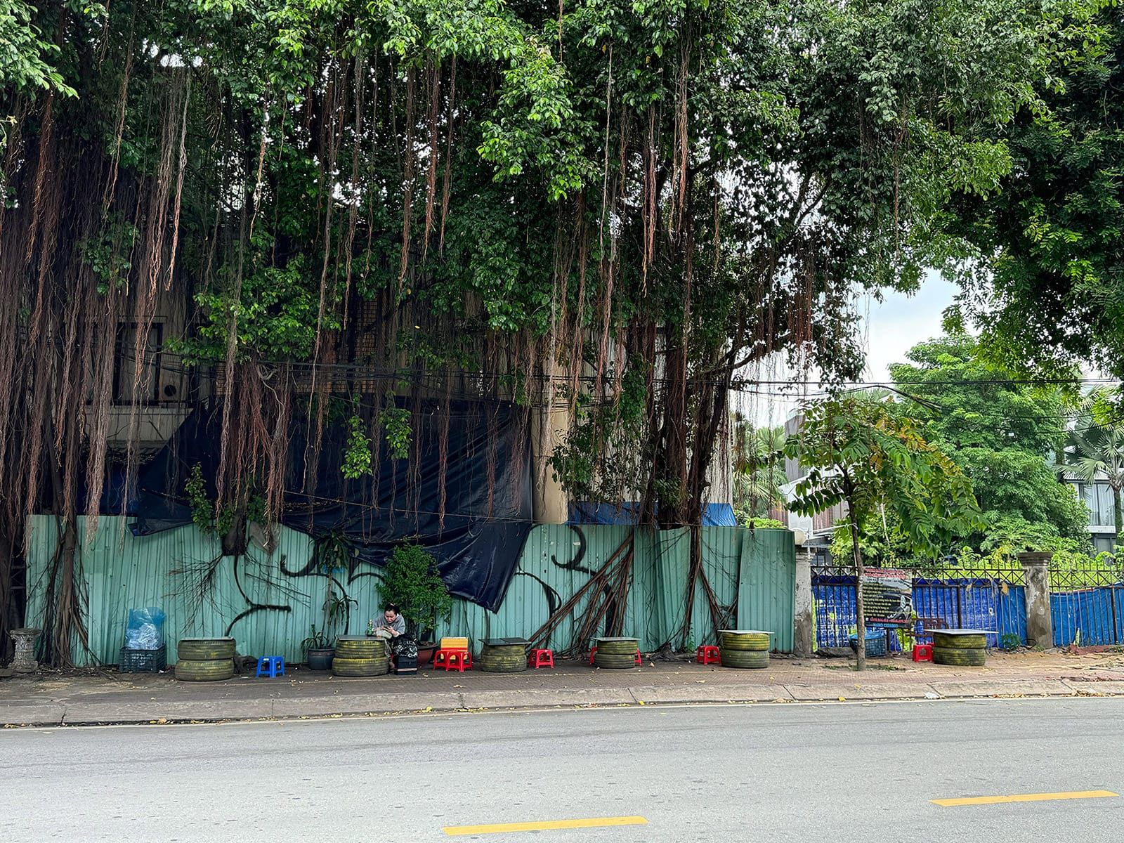 Bạn có thể chọn ngồi dưới bóng râm lớn, dựa vào bức tường sạch sẽ phía sau và nhìn ra con đường yên tĩnh.
