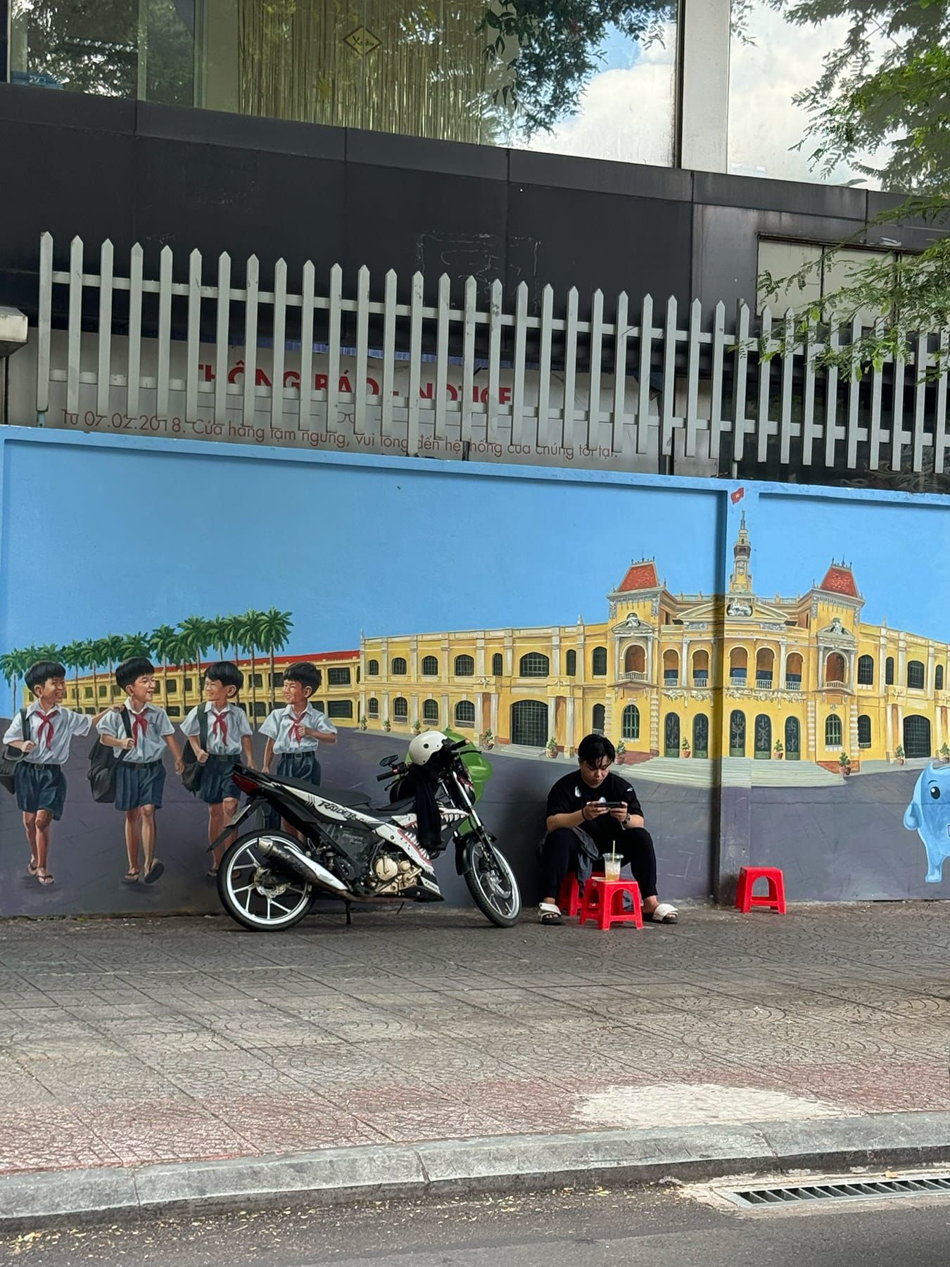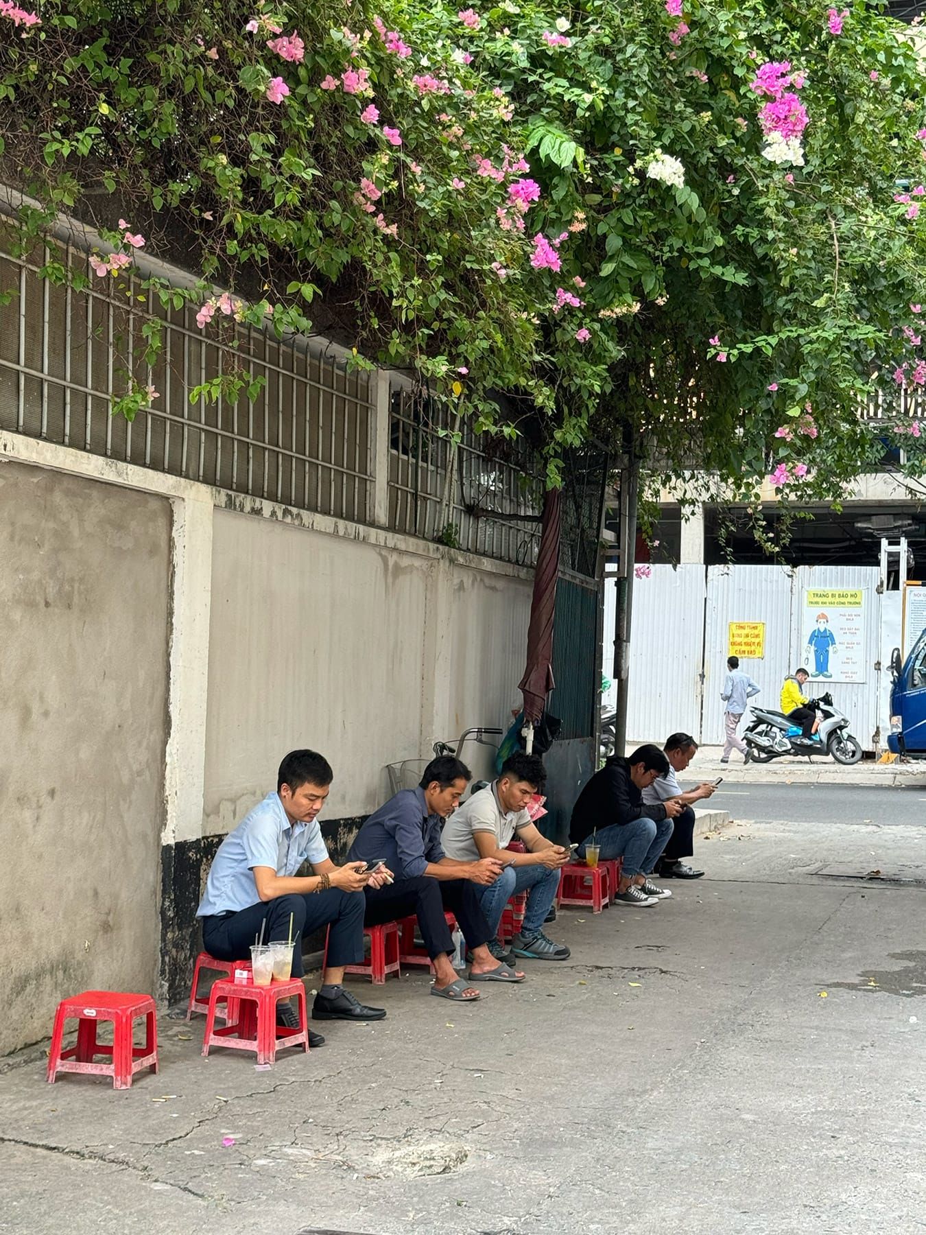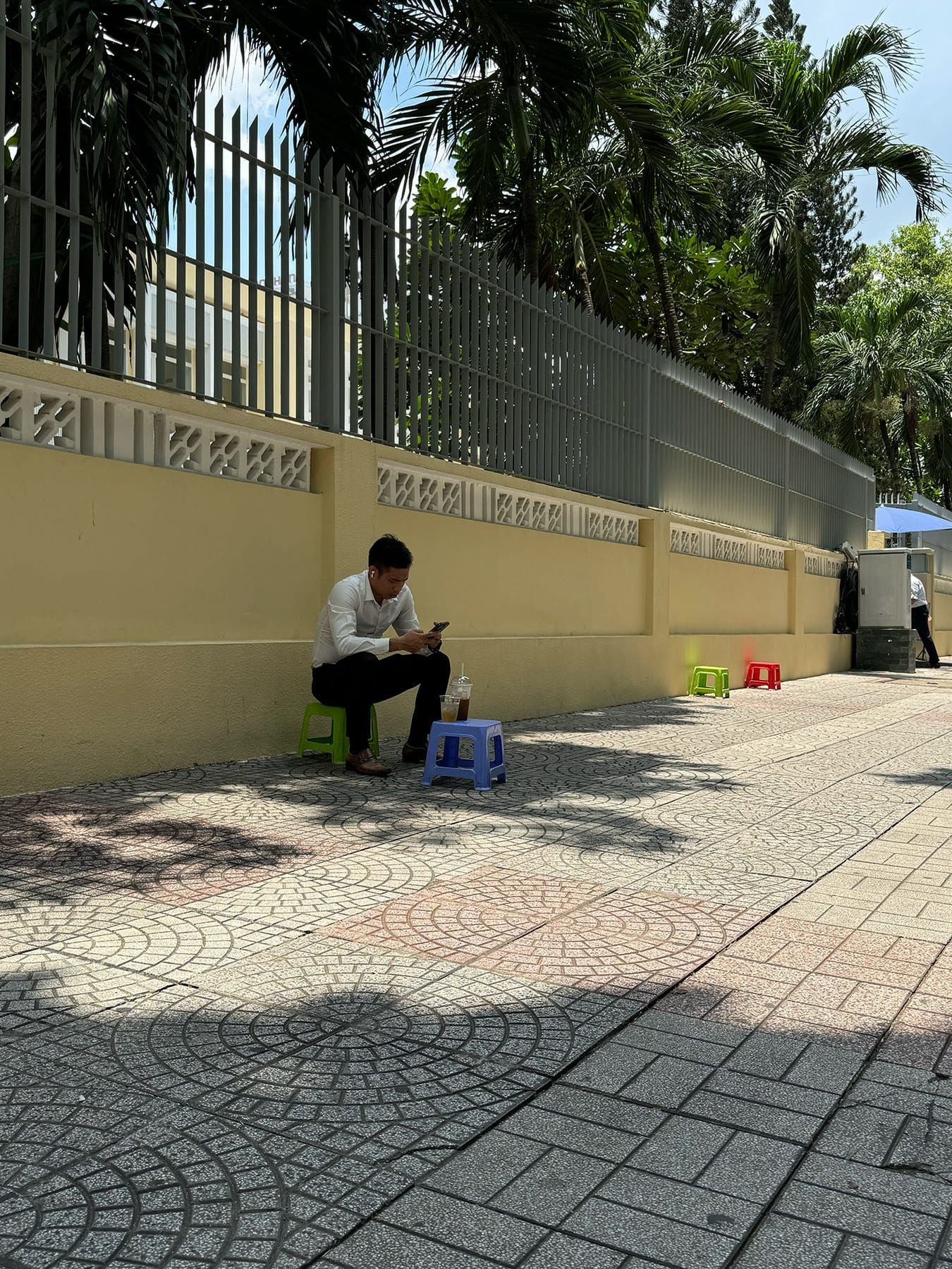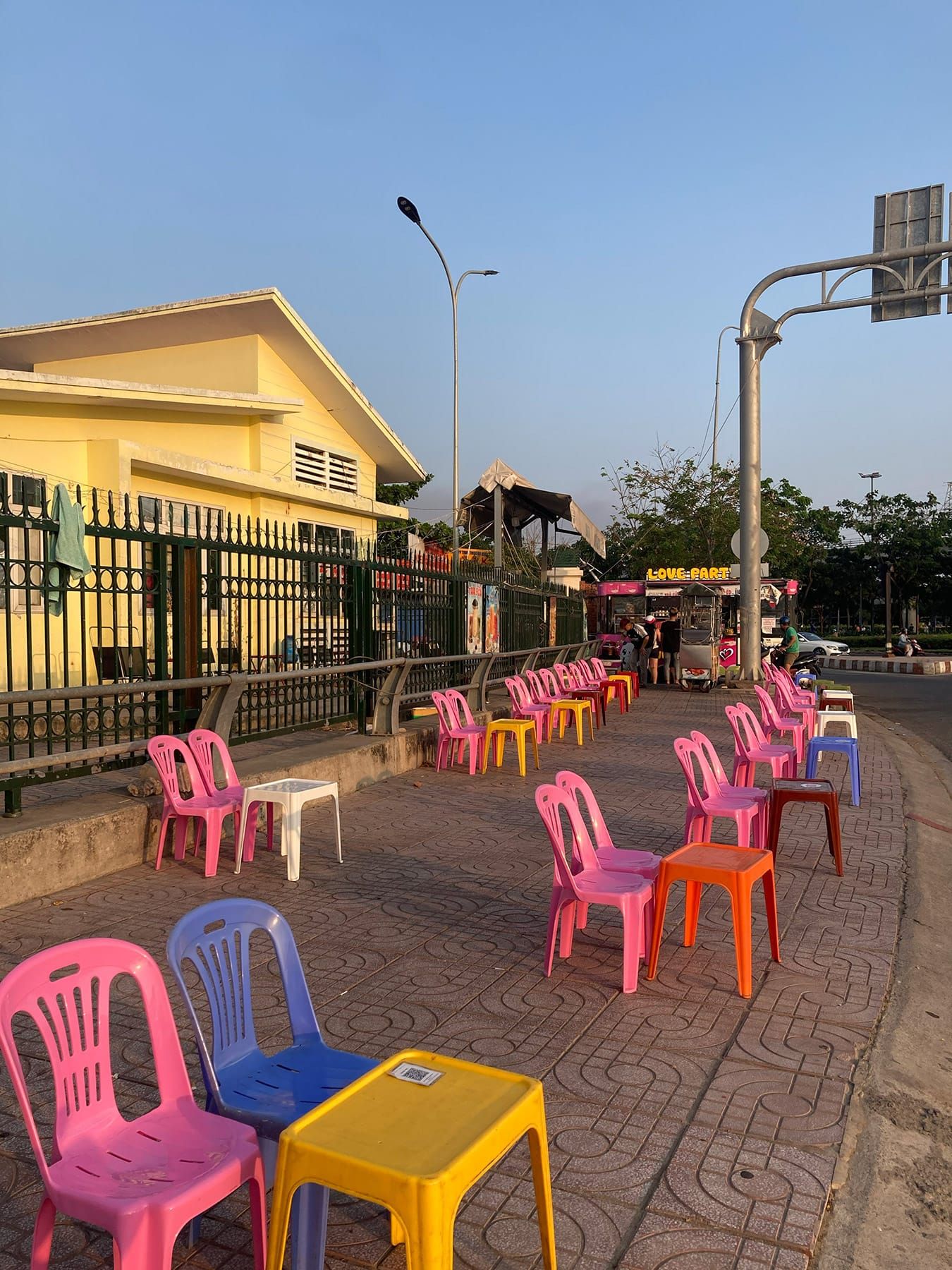 Bạn có thể chọn ngồi dưới bóng râm lớn, dựa vào bức tường sạch sẽ phía sau và nhìn ra con đường yên tĩnh.
