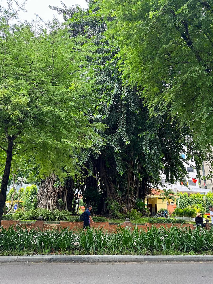 Ông cụ cây này hơn 300 tuổi, đường kính lên đến 6-7 mét, xum xuê lá, tạo thành 2 cổng nhỏ có thể đi qua. Cụ đứng trầm ngâm giữa trung tâm quận 1...