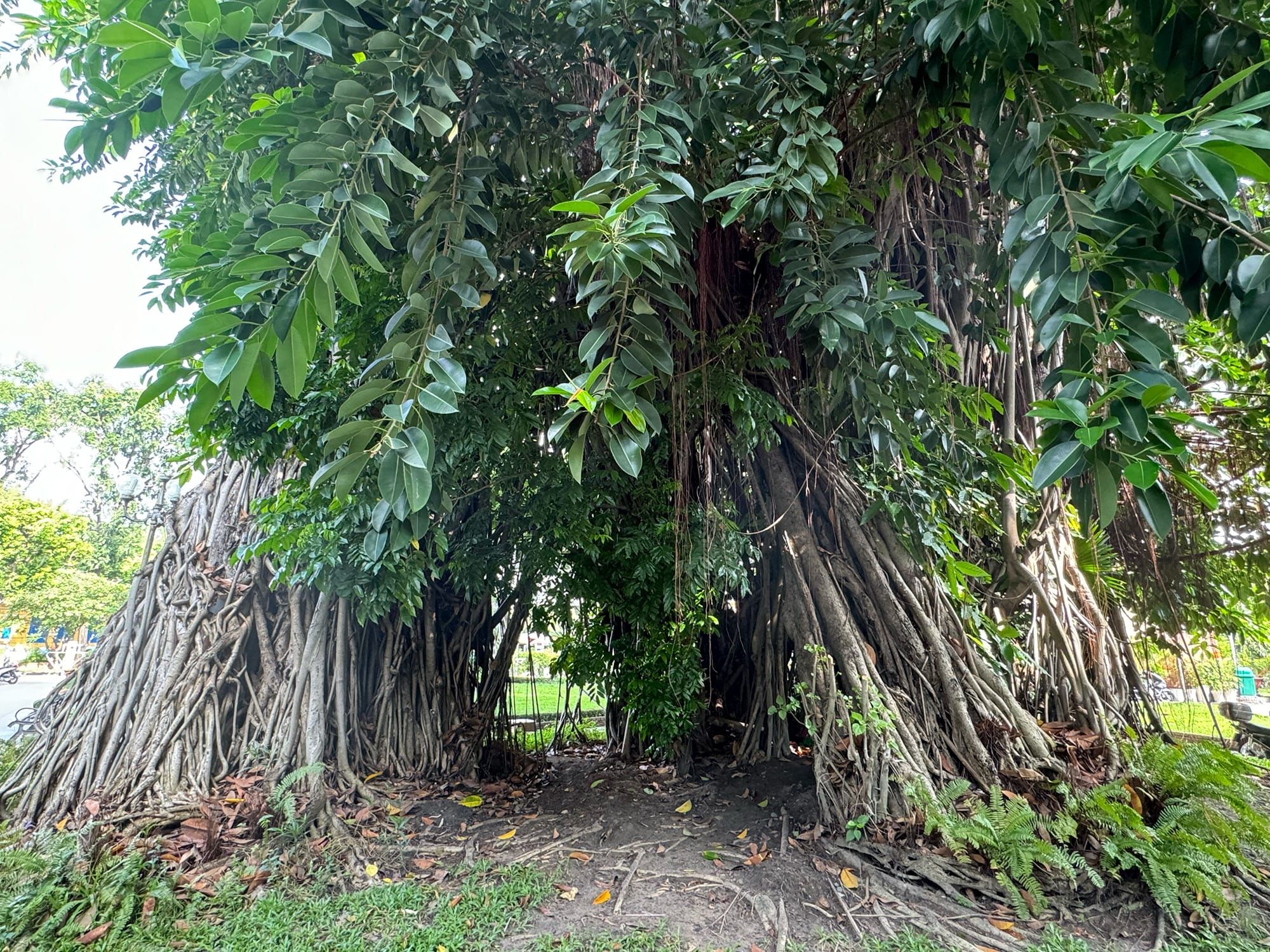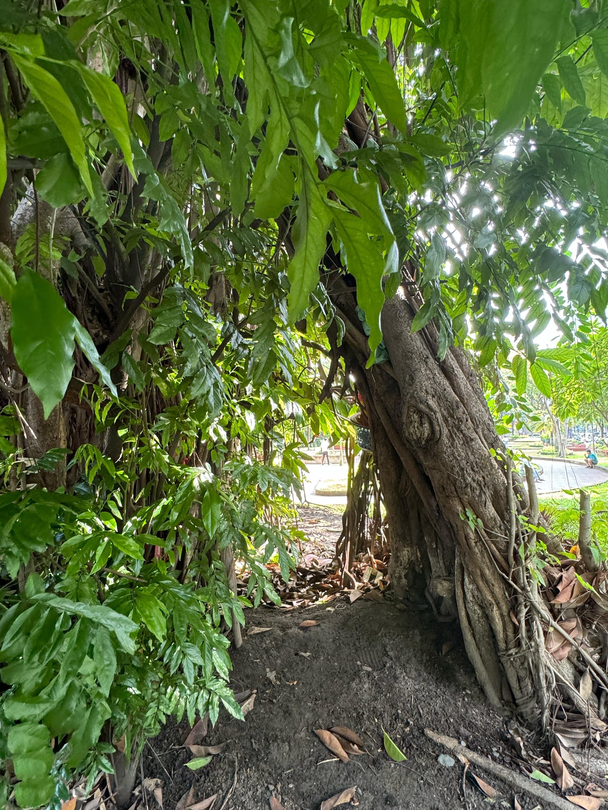 Giữa công viên Bách Tùng Diệp, không phải sừng sững mà chính xác là chan hòa - chan hòa một gốc đa lớn bằng cả ngôi nhà.