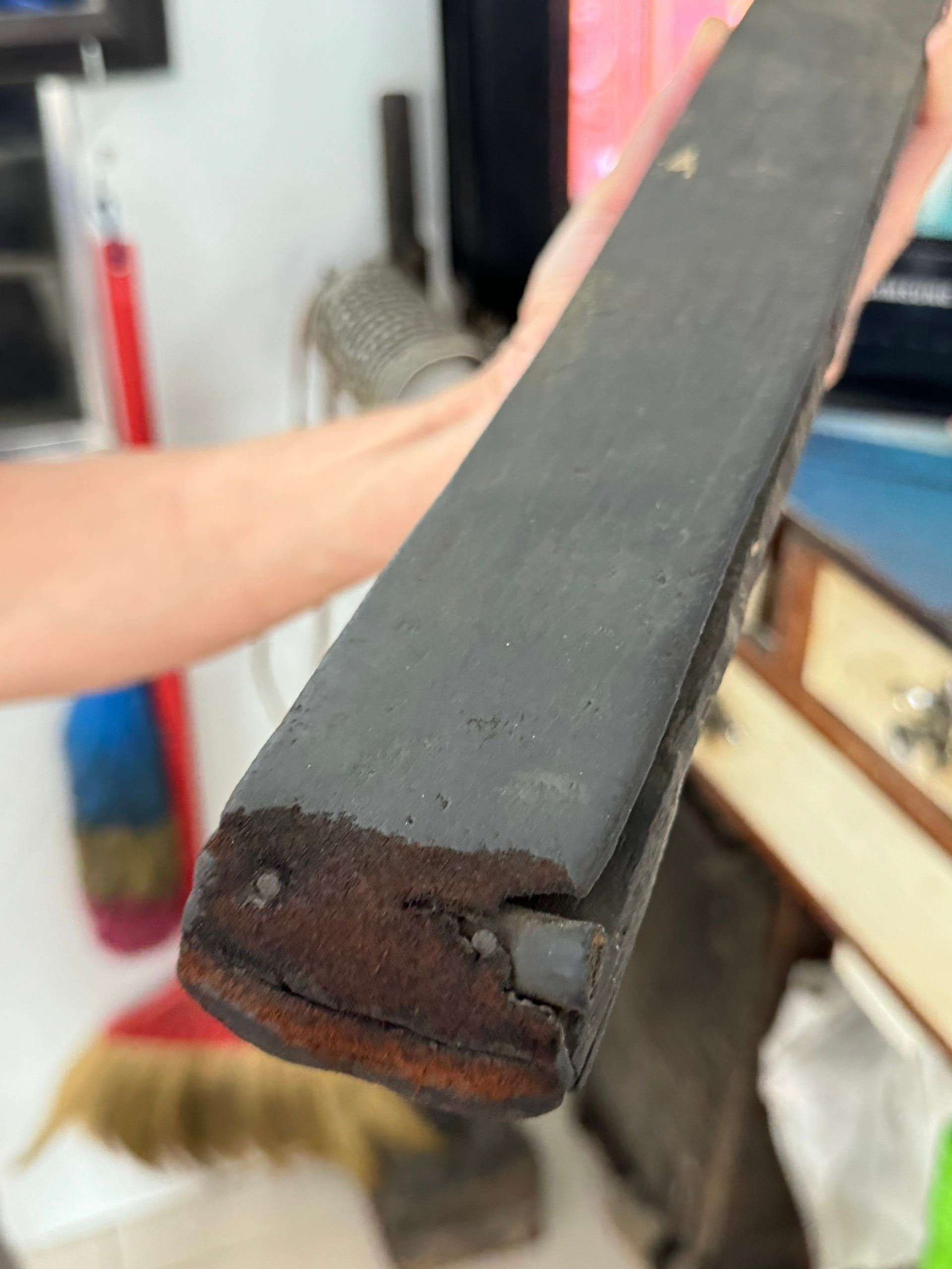Miếng da bò "liếc" dao này cũng 70 tuổi. Nó được bôi dầu thường xuyên để không bị ăn mòn. Phần nhám phía dưới là chút lông bò còn sót lại: